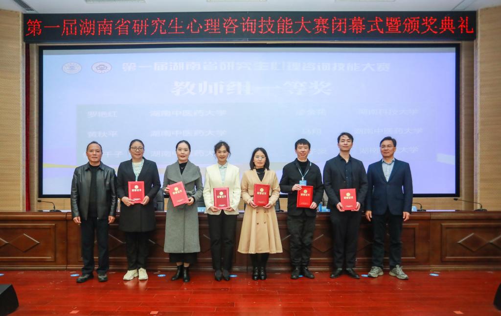 11月15日,由湖南省教育厅主办、我校承办、湖南省社会科学普及项目支持的第一届湖南省研究生心理咨询技能大赛在济世楼学术报告厅圆满落幕。湖南省教育厅学位管理与研究生教育处二级调研员刘梦清,我校党委委员陈鸿君出席颁奖典礼。