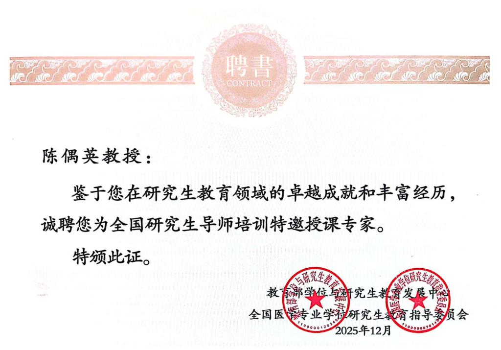 近日,我校护理学院院长、博士生导师陈偶英教授受教育部学位与研究生教育发展中心、全国医学专业学位研究生教育指导委员会联合聘任,担任“全国研究生导师培训班特邀授课专家”,并在12月1日至2日北京举办的第四期全国研究生导师培训班上作课程思政示范课程建设专题讲座。
