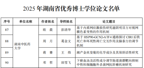 近期,2025年度湖南省优秀博士学位论文评选结果正式公布,我校在中医学、中药学和中西医结合主干学科领域成绩斐然,共有4篇博士学位论文获评“湖南省优秀博士学位论文”。此次获奖篇数创学校历史新高,标志着我校研究生培养质量实现了新的跨越。