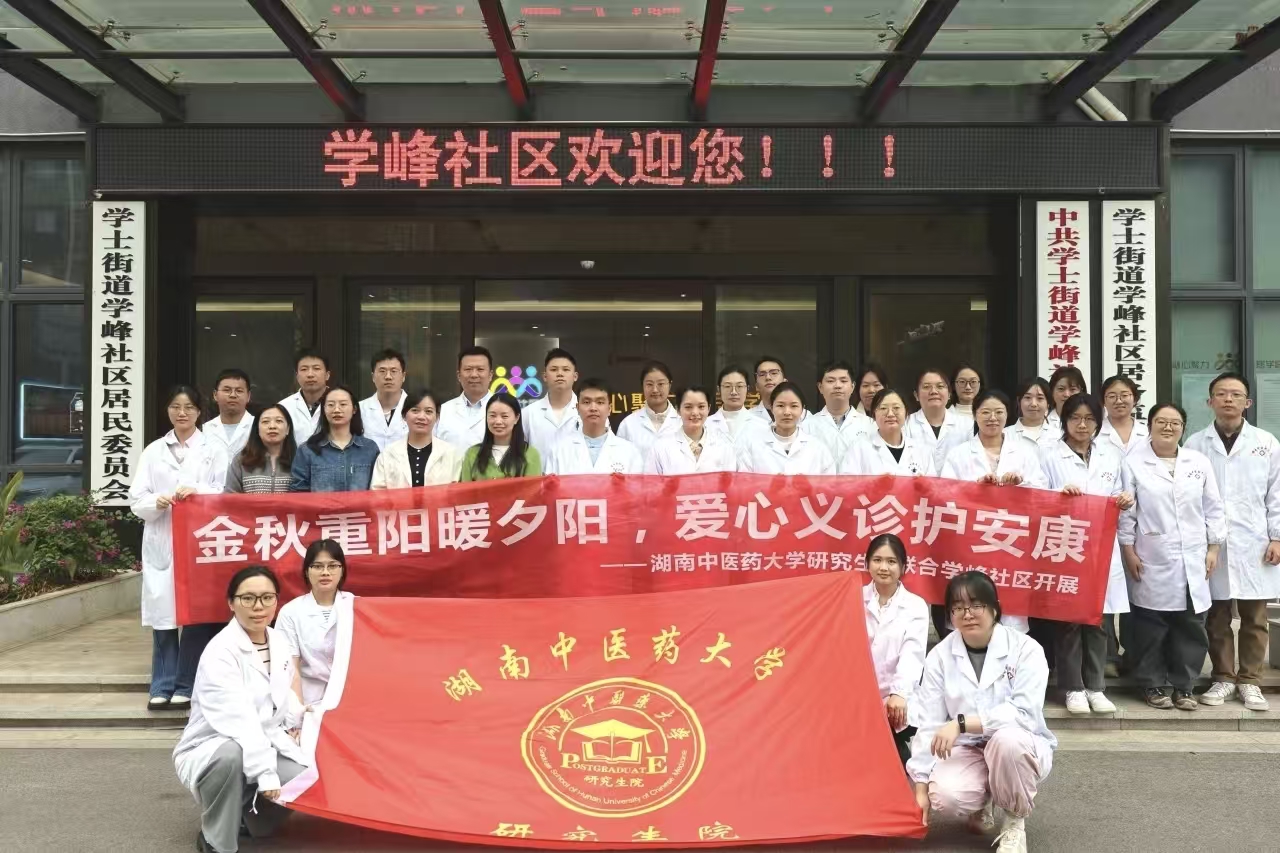 2025年10月29日上午,我校研究生院组织32名硕博研究生志愿者,走进长沙市岳麓区学士街道学峰社区,以“金秋重阳暖夕阳,爱心义诊护安康”为主题开展义诊志愿服务活动,将中医药健康服务送到居民家门口,用实际行动诠释医者仁心。