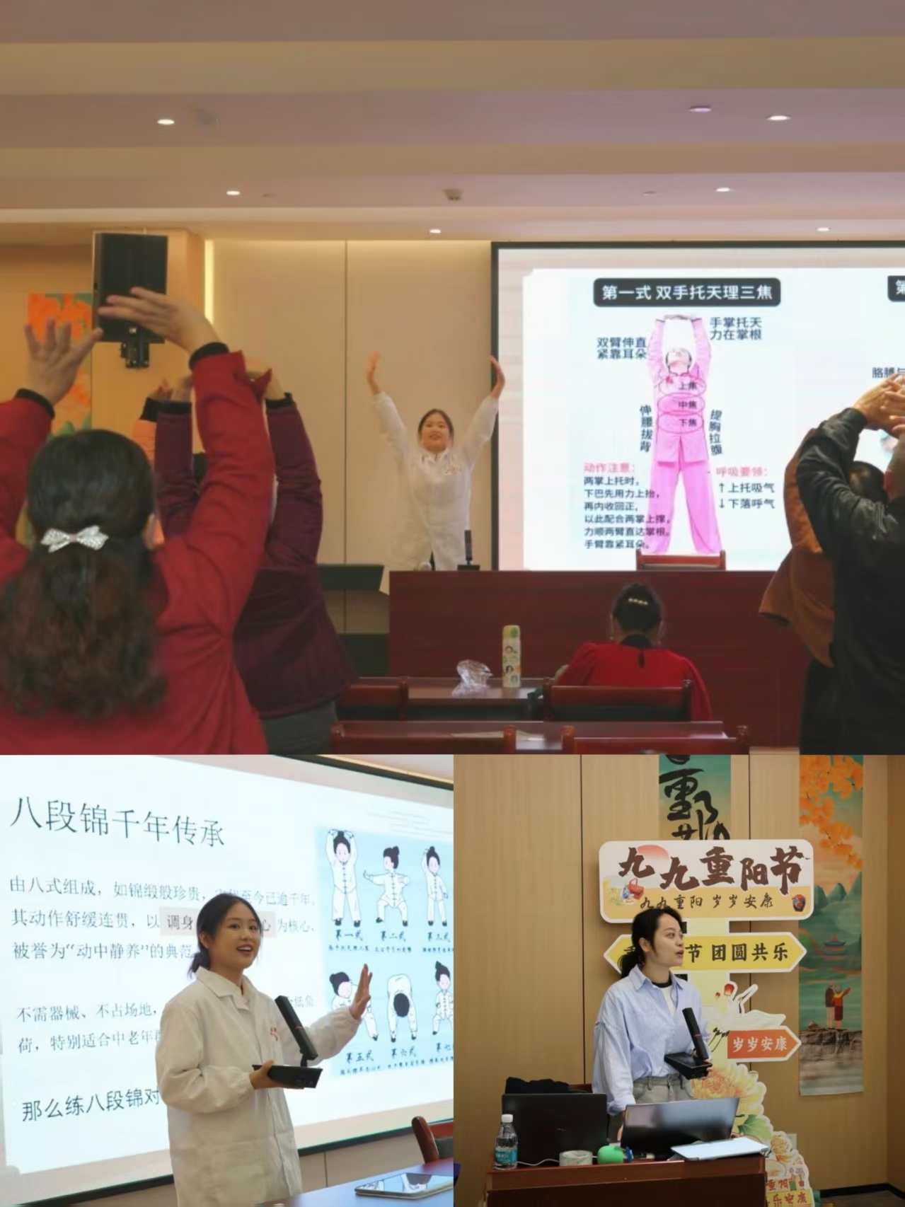 活动现场还开设了“重阳节养生”健康讲堂。志愿者围绕家庭常备药的储存方法、服药时间与禁忌等内容,深入浅出地普及安全用药常识,引导居民树立科学用药理念。在八段锦教学环节,居民们跟着志愿者舒展筋骨,在一招一式中体验传统养生功法的独特魅力,现场洋溢着温馨融洽的氛围。