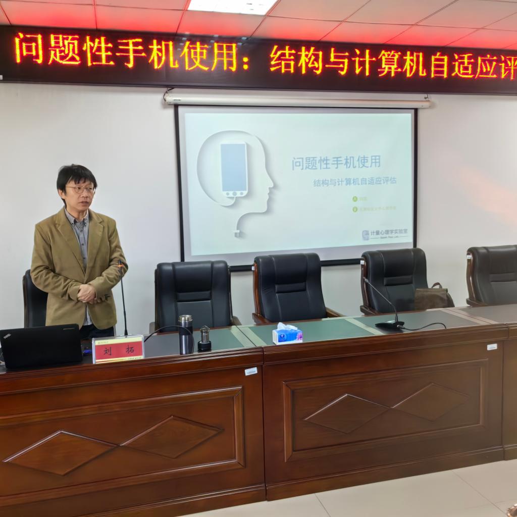 刘拓副教授以“问题性手机使用:结构与计算机自适应评估”为题,深入剖析了手机成瘾的科学内涵,并从“无手机恐惧”等独特视角展开研究。他重点介绍了团队在区分手机使用中的“问题性”与“功能性”成分方面的关键成果,阐述了构建高阶单维结构模型的理论基础与测量优势。他强调,其团队开发的计算机自适应评估技术,为高效、精准地测量问题性手机使用行为提供了可靠的方法支撑。